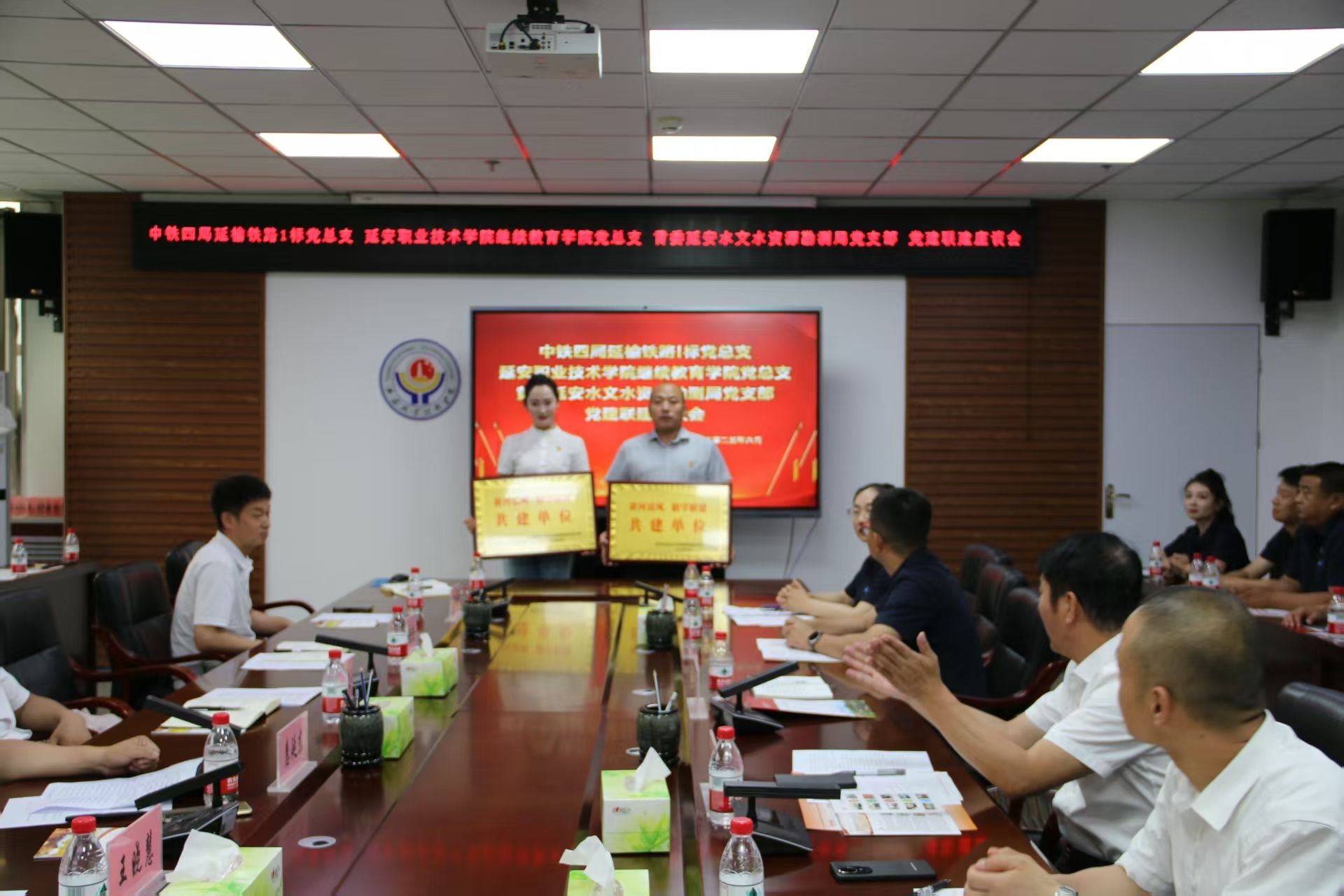 延安职业技术学院党委委员、副院长陈旭参加座谈会并致欢迎辞。陈旭介绍了学院的基本情况,对三方党建联建创新举措表示赞赏并提出了几点希望。中铁四局延榆铁路1标党总支书记张国昊、黄委会延安市水文水资源勘测局党支部书记惠丰分别就党建工作进行了经验交流发言。座谈会上,三方就党建联建进行了授牌仪式。